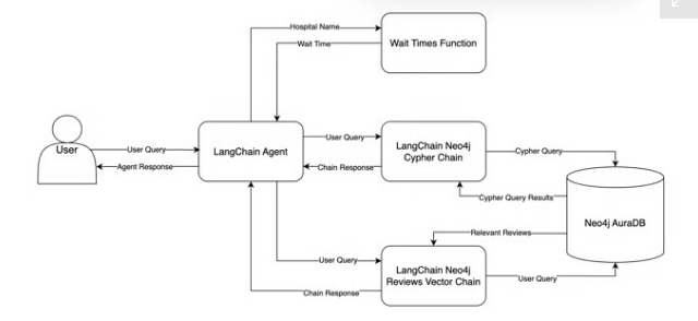 - Neo4j AuraDB : Neo4j AuraDB 그래프 데이터베이스에 구조화된 병원 시스템 데이터와 환자 리뷰를 모두 저장합니다. 다음 섹션에서 이에 대한 모든 내cnfcjddk용을 배우게 됩니다.