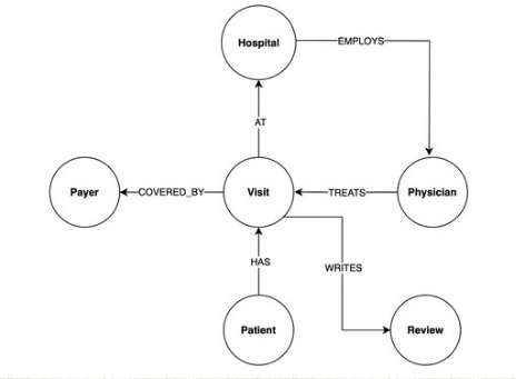 이 다이어그램은 병원 시스템 데이터의 모든 노드와 관계를 보여줍니다. 이 순서도에 대해 생각하는 한 가지 유용한 방법은 환자 노드에서 시작하여 관계를 따르는 것입니다. 환자가 병원을 방문 하고 병원은 보험금 지급인이 보장 하는 방문 치료를 위해 의사를 고용 합니다.
