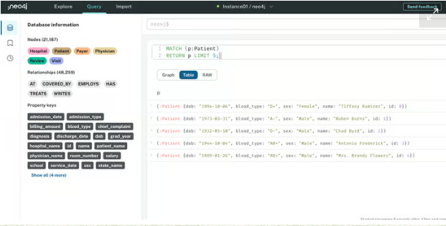 테이블 보기에는 해당 속성과 함께 반환된 5개의 환자 노드가 표시됩니다. 관심이 있는 경우 그래프와 원시 보기를 탐색할 수도 있습니다.