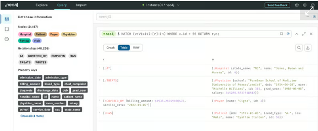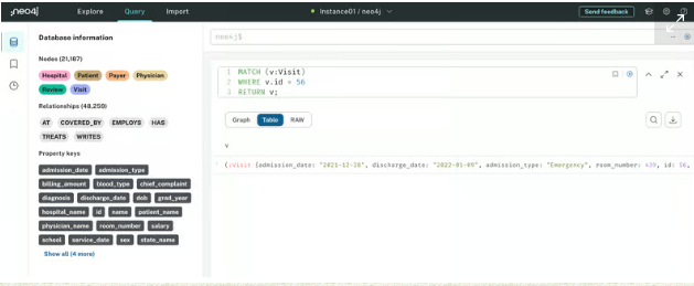 이 쿼리는 WHERE v.id = 56에서 지정한 56의 id를 가진 Visit 노드와 일치합니다. WHERE절의 임의 노드 및 관계 속성을 필터링할 수 있습니다. 이 쿼리의 결과는 다음과 같습니다.