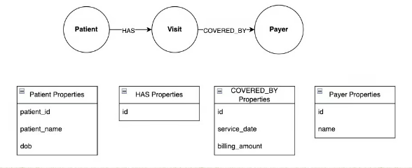 보시다시피 COVERED_BY는 id 속성 이상의 유일한 관계입니다. service_date는 환자가 방문 후 퇴원한 날짜이고, billing_amount는 방문에 대해 지불인에게 청구되는 금액입니다.