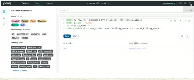 텍사스에서 Aetna가 보장하는 방문에 대한 총 방문 횟수와 총 청구 금액은 얼마입니까?라는 질문에 대답하고 싶다고 가정해 보겠습니다. 이 질문에 답하는 Cypher 쿼리는 다음과 같습니다.