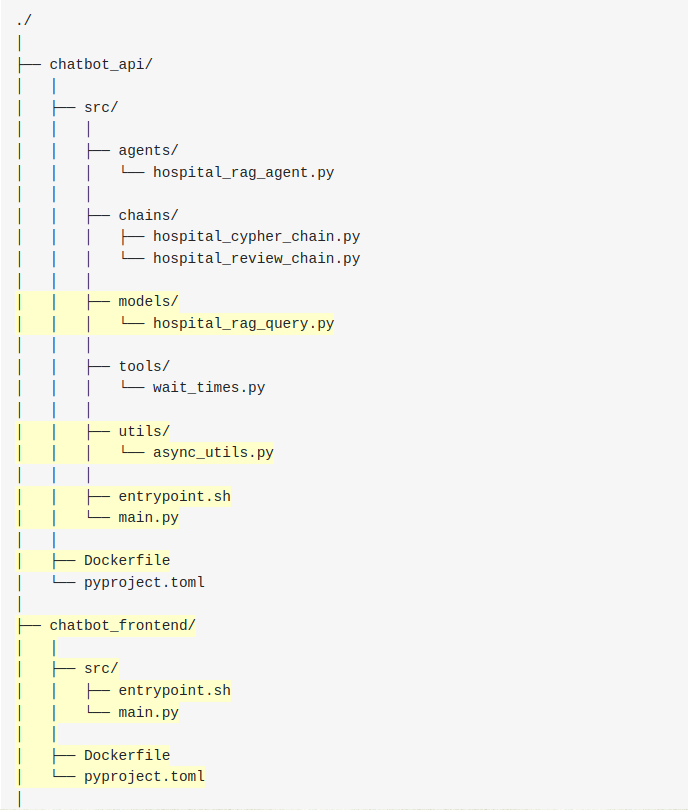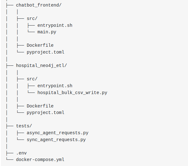 여기에 ./chatbot_api의 Dockerfile에서 파생된 chatbot_api 서비스를 추가합니다 . 이는 hospital_neo4j_etl에 의존하며 포트 8000에에서 실행됩니다.