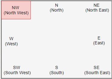 | NW | 북서쪽 또는 왼쪽 위 |